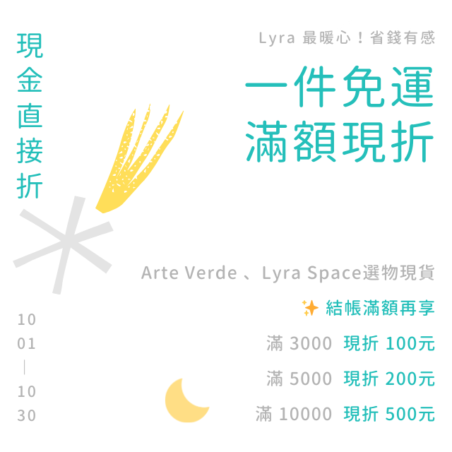 ‧ 購買「Arte Verde系列常態性現貨商品」以及「Lyra選物商品」單筆消費金額累計滿3,000元現折100元,滿5,000元現折200元,滿10,000元現折500元。(滿13,000元現折600元,依此類推...)。