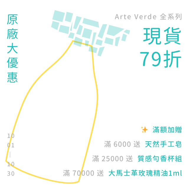 ‧ 購買「Arte Verde系列常態性現貨商品」單筆消費金額(折扣後)滿額贈:滿 6,000元贈送手工皂乙個。滿 25,000元贈送質感勻香杯組。滿 70,000元贈送大馬士革玫瑰精油1ml。贈完為止。